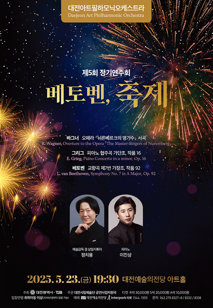 [대전타임뉴스=홍대인 기자] 대전아트필하모닉오케스트라가 오는 5월 23일(금) 저녁 7시 30분 대전예술의전당 아트홀에서 제5회 정기연주회 ‘베토벤, 축제’를 연다. 이번 공연은 정치용 예술감독 겸 상임지휘자의 지휘 아래, 바그너, 그리그, 베토벤의 명곡을 통해 오케스트라의 역동성과 감성을 선보일 예정이다. 공연의 서막은 바그너의 오페라 '뉘른베르크의 명가수' 서곡으로 장식된다. 이 곡은 웅장한 관현악과 찬란한 선율로 청중을 압도하며 연주회의 문을 연다. 이어 피아니스트 이진상이 협연자로 무대에 올라, 그리그의 '피아노 협주곡 가단조, 작품 16'을 연주한다. 이 곡은 북유럽의 서정성과 강렬한 감정이 조화를 이루며, 그리그의 대표작으로 널리 알려져 있다. 협연자인 이진상은 스위스 게자 안다 콩쿠르에서 동양인 최초로 우승한 실력파 피아니스트로, 국내외 유수의 오케스트라와 활발히 협연하고 있으며, 현재 한국예술종합학교 교수로 재직 중이다. 마지막 무대는 베토벤의 ‘교향곡 제7번 가장조’로 장식된다. 이 곡은 리듬감 넘치는 선율로 '춤추는 교향곡'이라는 별칭을 갖고 있으며, 특히 2악장은 다양한 영화의 배경음악으로 사용되어 대중에게 익숙하고 깊은 감동을 선사한다. 정치용 예술감독은 “이번 무대는 대전아트필하모닉의 색채와 에너지를 만끽할 수 있는 무대가 될 것"이라며 “관객과 함께 음악의 감동을 나누는 시간이 되길 바란다"고 밝혔다. 공연 관련 예매 및 자세한 정보는 대전예술의전당 홈페이지 또는 대전시립예술단 공연사업지원국(042-270-8332, 8327~8)을 통해 확인할 수 있다.