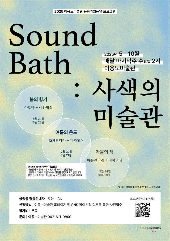 [대전타임뉴스=홍대인 기자] 대전고암미술문화재단 이응노미술관(대표이사·관장 이갑재)이 5월부터 10월까지 매월 마지막 주 수요일에 일반 시민을 위한 문화 치유 프로그램인 〈Sound Bath: 사색의 미술관〉을 운영한다. 본 프로그램은 ‘2025 문화가 있는 날’ 사업의 일환으로, 예술과 명상을 결합한 특별한 미술 교육 프로그램이다. ‘Sound Bath: 사색의 미술관’은 계절의 감각을 주제로 아로마, 오브제 작업, 색채 표현 등 다양한 감각 활동과 함께 싱잉볼과 오션드럼 등 명상 도구를 활용한 사운드 명상을 통해 시민들이 내면의 소리에 집중하고 감정을 치유할 수 있도록 구성됐다. 이 프로그램은 계절별 테마를 중심으로 다음과 같이 진행된다. ▲봄(5월 28일·6월 25일) : ‘봄의 향기’를 주제로 아로마 오일을 직접 제작하고 싱잉볼 소리와 함께 이완 명상을 진행▲여름(7월 30일·8월 13일) : ‘여름의 온도’를 주제로 조개 오브제로 만다라를 만들고 오션드럼 소리와 함께 바다 명상 체험▲가을(9월 24일·10월 29일) : ‘가을의 색’을 주제로 손가락으로 색을 표현하며 내면 감정을 그려보고 정화 명상을 통해 감정 정리 각 회차는 오후 2시부터 4시까지 총 2시간 동안 운영되며, 이응노미술관 상설전 《이응노, 문자로 엮은 추상》에 대한 도슨트 전시 해설(30분)과 본 프로그램(90분)으로 구성된다. 교육은 미술관 전시장과 야외잔디마당에서 번갈아 진행된다. 8월은 미술관 휴관 일정에 따라 8월 13일(수요일)로 조정된다. 이갑재 관장은 “현대인의 지친 일상 속에서 예술이 주는 감각적 경험과 명상의 만남은 몸과 마음을 치유하는 소중한 기회가 될 것"이라며 “시민 누구나 예술로 삶을 재충전하는 자리가 되길 바란다"고 밝혔다. 참가는 사전 신청을 통해 가능하며, 참가비는 무료다. 회당 정원은 15명으로 제한되며, 이응노미술관 홈페이지([www.leeungnomuseum.or.kr](http://www.leeungnomuseum.or.kr)) 및 공식 SNS(인스타그램) 참여 링크를 통해 신청할 수 있다.