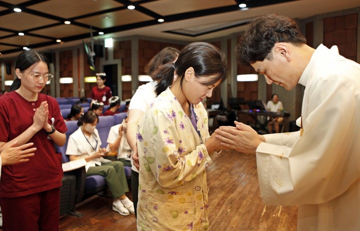 [대전타임뉴스=홍대인 기자] 가톨릭대학교 대전성모병원(병원장 강전용 신부)은 6월 20일 입사 1년을 맞은 간호사 70명을 대상으로 ‘손축복식’을 개최했다. 이날 행사는 오후 4시 병원 9층 대강당 상지홀에서 열렸으며, 지난 1년간 현장에서 역량을 키워온 간호사들의 성장을 축하하고, 그 손길이 ‘소중한 생명을 살리는 치유의 손’임을 되새기기 위해 마련됐다. 축복예식은 대전성모병원 원목실 김제동 실장신부의 주례로 진행됐다. 김 신부는 “간호사 한 사람, 한 사람의 따뜻한 손길을 통해 질병으로 고통받는 환우들이 희망을 품을 수 있기를 기도한다"고 전했다. 민승희 간호부장은 “오늘 축복을 받은 간호사들이 앞으로도 고통에 손을 내밀고, 위로를 전하며, 환자에게는 감사와 희망이 되는 손길을 잊지 않길 바란다"며 “앞으로의 병원 생활도 변함없이 응원한다"고 말했다. 대전성모병원은 매년 입사 1주년을 맞은 간호사를 대상으로 손축복식을 진행하고 있으며, 병원 간호철학인 ‘치유와 사랑의 실천’ 가치를 되새기는 의미 있는 전통으로 자리잡고 있다.