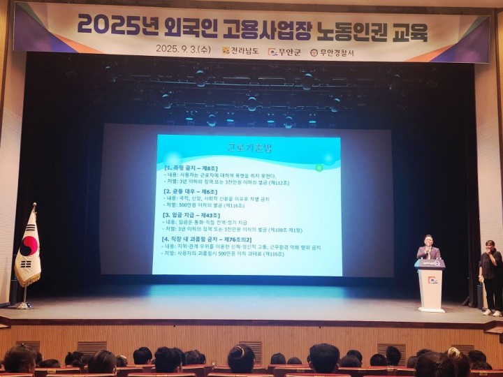 이번 교육은 코리아노무법인 신인철 노무사를 초빙해 ▲근로자의 기본권 이해 ▲사업장에서의 인권침해 예방 ▲문화적 차이에 대한 존중과 배려 등을 주제로 구성됐으며 무안경찰서의 기초질서 및 인권 보호 캠페인도 함께 진행됐다.무안군 관계자는 “서로 다른 문화와 언어 속에서 생길 수 있는 오해를 줄이고 외국인 근로자와 사업주(농가주)가 상생할 수 있는 환경을 만들기 위해 교육을 추진했다"며, “이번 교육이 고용 현장의 갈등을 줄이고 건강한 고용 문화 정착에 도움이 되기를 바란다"고 말했다.