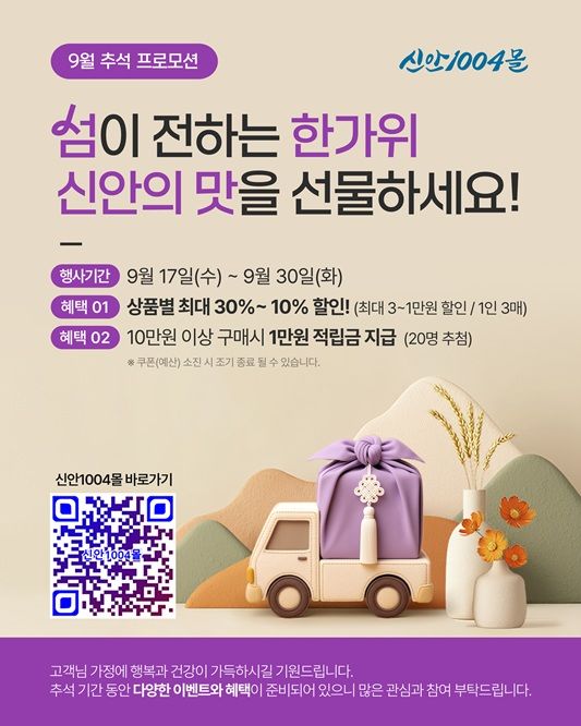 신안군 관계자는 “이번 추석 기획전은 단순히 할인 행사를 넘어, 소비자들이 고품질의 신안군 특산품을 합리적인 가격에 구매하며 알뜰하게 명절을 준비하고, 동시에 지역 소상공인과 농어가에는 온라인 판매를 통한 실질적인 도움을 제공하는 상생의 의미를 담고 있다"고 전했다.
