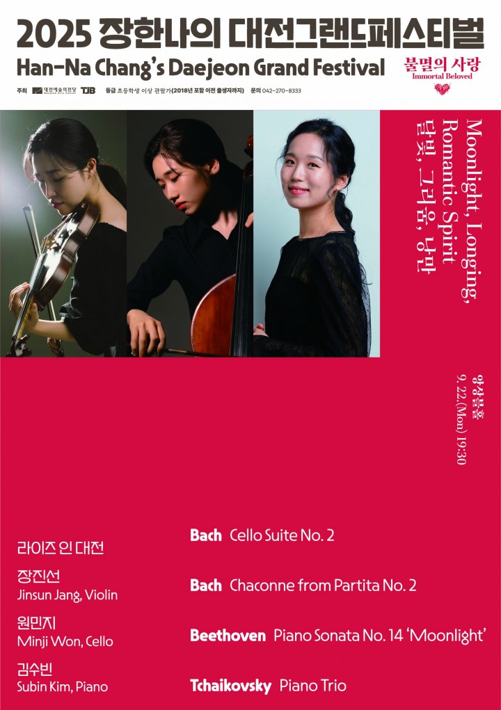 [대전타임뉴스=홍대인 기자] 대전예술의전당 앙상블홀에서 9월 22일 오후 7시 30분 ‘2025 장한나의 대전그랜드페스티벌’ 메인 프로그램 중 하나인 ‘라이즈 인 대전: 달빛, 그리움, 낭만’ 공연이 열린다. 이번 무대에는 바이올리니스트 장진선, 첼리스트 원민지, 피아니스트 김수빈이 출연한다. 공연은 독주와 협연으로 구성되며, 전반부에는 바흐 무반주 첼로 모음곡, 무반주 바이올린 파르티타, 베토벤 피아노 소나타 14번 ‘월광’이 연주된다. 후반부에서는 차이코프스키 피아노 트리오 가단조 Op.50이 무대에 오른다. 이번 공연은 페스티벌 둘째 날 프로그램으로, 대전 지역을 대표하는 젊은 음악가들이 참여해 세계적으로 널리 연주되는 주요 레퍼토리를 선보인다는 점에서 의미가 크다. 장한나 예술감독은 “위대한 작곡가들이 음악이라는 ‘불멸의 사랑’에 자신을 바쳤던 것처럼, 이번 연주가 관객에게도 각자의 삶 속에서 발견할 수 있는 ‘불멸의 사랑’을 돌아보게 하는 시간이 되기를 바란다"고 밝혔다. 관람과 관련한 자세한 사항은 대전예술의전당 홈페이지(www.daejeon.go.kr/djac)에서 확인하거나 042-270-8333으로 문의하면 된다.