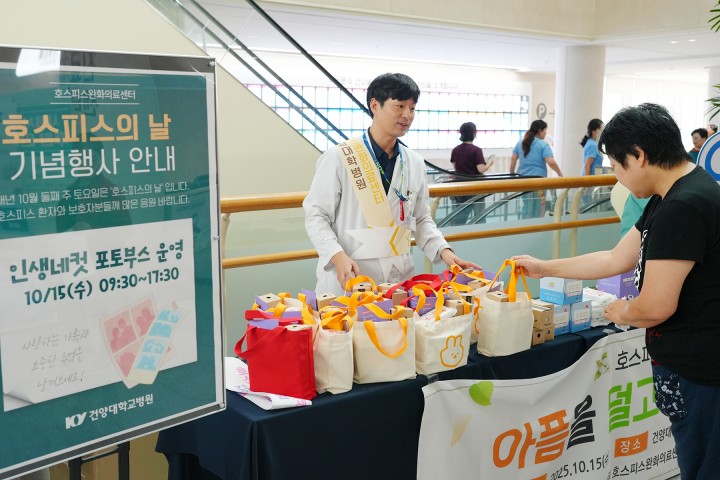 [대전타임뉴스=홍대인 기자] 건양대학교병원(의료원장 배장호)은 15일 본관 1층 로비에서 ‘아픔을 덜고, 마음을 채우다’를 주제로 제13회 호스피스의 날 기념 완화의료 주간 행사를 성황리에 개최했다고 밝혔다. 이번 행사는 삶의 마지막 순간까지 환자와 가족의 존엄한 삶을 지지하고, 호스피스·완화의료의 중요성에 대한 사회적 인식을 높이기 위해 마련됐다. ‘호스피스의 날’은 매년 10월 둘째 주 토요일로 지정된 기념일로, 「호스피스·완화의료 및 임종과정에 있는 환자의 연명의료결정에 관한 법률(연명의료결정법)」에 근거해 제정됐다. 이 날은 삶과 죽음의 의미와 가치를 되새기고 환자의 자기결정권을 존중하는 문화 확산에 기여하고 있다. 행사 당일에는 ▲완화의료 OX 퀴즈 이벤트 ▲홍보물·기념품 배포 등 다양한 프로그램이 마련돼 환자와 보호자, 병원 내원객들이 함께 참여하며 따뜻한 공감과 긍정적 인식을 나누는 시간을 가졌다. 건양대병원 호스피스완화의료센터는 말기 암 환자와 가족이 겪는 신체적·심리적·사회적·영적 고통을 완화하기 위해 의사, 간호사, 사회복지사, 성직자, 자원봉사자 등 다학제 전문팀을 운영하고 있다. 환자와 가족의 삶의 질 향상과 존엄한 생의 마무리를 위한 전인적 돌봄을 실천하고 있다. 조도연 센터장은 “호스피스와 완화의료는 단순히 죽음을 준비하는 과정이 아니라, 남은 생을 더 의미 있게 살아가도록 돕는 의료 서비스"라며 “앞으로도 환자와 가족이 평안한 시간을 보낼 수 있도록 최선을 다하겠다"고 말했다.