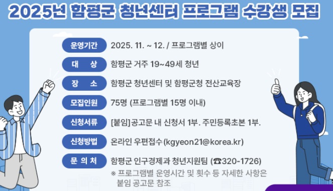 센터는 앞으로 청년정책 상담, 역량개발 교육, 문화교류 프로그램 등 다양한 청년 지원사업을 상시 운영할 예정이다. 위치는 나비어울림센터 3층이다.이번 교육은 11월부터 12월까지 운영되며, 함평군에 주소를 둔 만 19세 이상 49세 이하 청년이면 누구나 신청할 수 있다.운영 프로그램은 ▲GTQ 자격증 취득을 위한 일러스트레이터·포토샵 활용 교육 ▲컴퓨터활용능력 자격과정 ▲취업 대비 토익 특강 ▲‘영상제작자 첫걸음’ 기초 영상편집 과정 ▲블로그 수익화를 위한 실무형 블로그 마케팅 교육 등으로 구성됐다.
