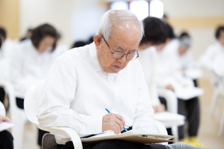▲지난 11월 29일 실시된 제3회 계시록 성구 암기 시험에 응시한 자문회 성도가 답을 써 내려가고 있는 모습.(사진제공=신천지 베드로지파)