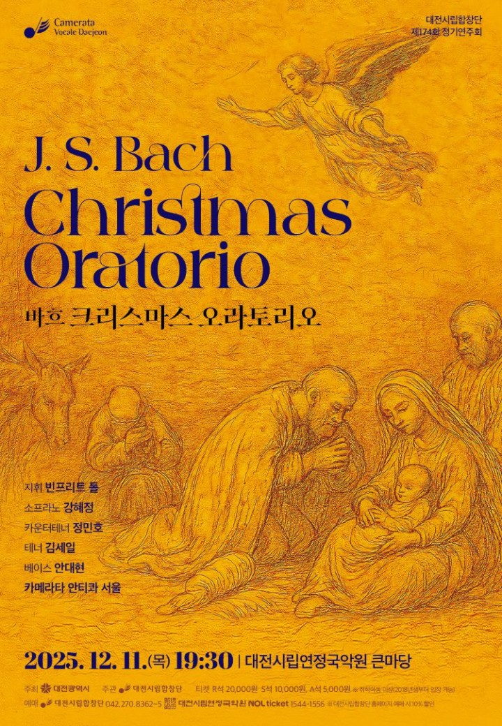 [대전타임뉴스=홍대인 기자] 대전시립합창단이 11일 오후 7시 30분 대전시립연정국악원 큰마당에서 바흐의 성탄 음악을 주제로 한 제174회 정기연주회 크리스마스 오라토리오를 연다. 이번 공연은 바흐의 신앙심과 예술 세계를 온전히 경험할 수 있는 연말 대표 무대로 꾸며지며, 빈프리트 톨 예술감독의 지휘 아래 국내 정상급 성악가들이 참여해 성탄의 의미를 깊은 울림으로 전달한다. 공연은 바흐 모테트 작품 225 새 노래로 여호와께 노래하라로 시작한다. 두 개의 합창단이 대위법적 구조로 얽히며 웅장한 하모니를 만드는 곡으로, 환희와 역동성을 담은 대작으로 알려져 있다. 이어 바흐 걸작 가운데 하나인 작품 248 크리스마스 오라토리오 중 1부와 5부, 6부가 연주된다. 예수 탄생을 전하는 목자들의 이야기와 베들레헴 별, 동방박사의 방문을 묘사하며 성탄 서사를 음악으로 그려내는 대목들로 구성됐다. 이번 무대에는 대전시립합창단 예술감독 빈프리트 톨을 중심으로 소프라노 강혜정, 카운터테너 정민호, 테너 김세일, 베이스 안대현이 솔리스트로 참여한다. 바로크 음악 전문 연주단체 카메라타 안티콰 서울과 대전시립합창단이 함께 연주하며 깊은 울림의 합창을 선보인다. 시립예술단의 연말 공연이 지역 문화계에 미치는 파급 효과가 크다는 점에서 이번 무대는 대전 공연예술 활성화에도 의미 있는 장면으로 평가된다. 대전시립합창단은 이번 연주회가 한 해를 마무리하는 시민들에게 따뜻한 위로를 전하고, 지역 공연예술의 저력을 보여주는 시간이 될 것으로 기대하고 있다. 입장료는 R석 2만 원, S석 1만 원, A석 5천 원이며, 예매는 대전시립합창단과 대전시립연정국악원, 인터파크에서 가능하다. 문의는 대전시립합창단으로 하면 된다.