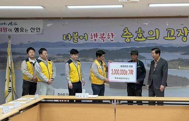 ▲목포 송림 라이온스클럽이 저소득 독거노인을 위해 성금을 기탁했다.(사진제공=신안군)