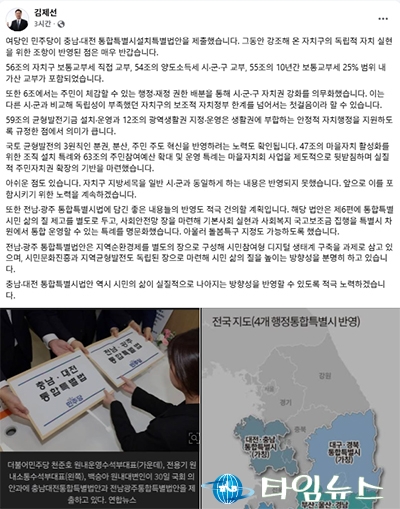 [대전타임뉴스=홍대인 기자] 김제선 대전 중구청장이 2월 1일 페이스북에서 더불어민주당이 제출한 대전·충남 통합특별시법안 56조 자치구 보통교부세 직접 교부, 54조 양도소득세 시·군·구 교부, 55조 10년간 보통교부세 25% 가산 조항은 환영하면서도 자치구 지방세목이 빠진 점은 아쉽다고 밝혔다. 자치구 재정 독립 진전과 세목 권한 한계를 동시에 언급한 것이다.