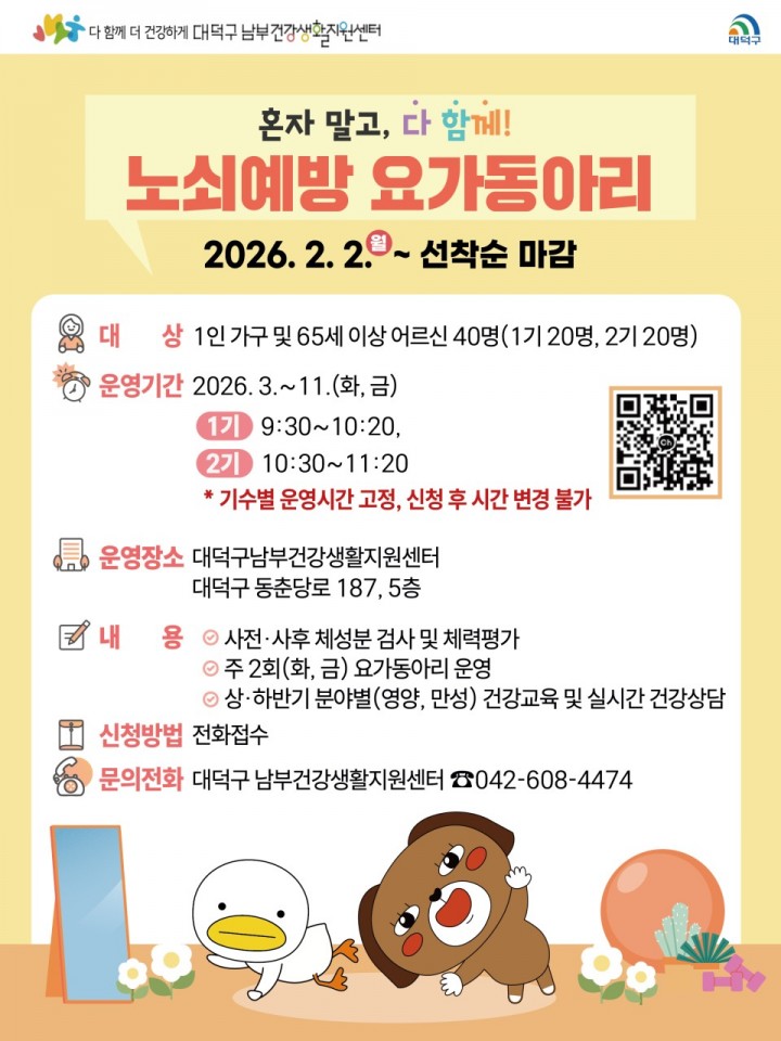 [대전타임뉴스=홍대인 기자] 대전 대덕구 남부건강생활지원센터가 1인 가구와 65세 이상 어르신 40명을 대상으로 ‘혼자 말고, 다 함께 요가동아리’ 참여자를 모집한다. 3월부터 11월까지 주 2회 운영되는 건강 프로그램이다.
