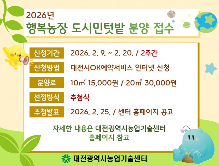 [대전타임뉴스=홍대인 기자] 대전시농업기술센터는 2월 9일부터 20일까지 OK예약서비스로 도시민텃밭 110구획 신청을 받는다. 10㎡ 65구획과 20㎡ 45구획을 무작위 추첨으로 선정하고, 4월 11일 개장해 11월 23일까지 운영한다.
