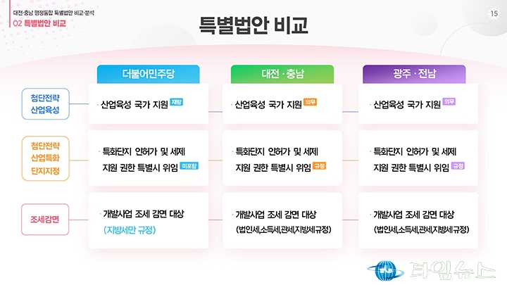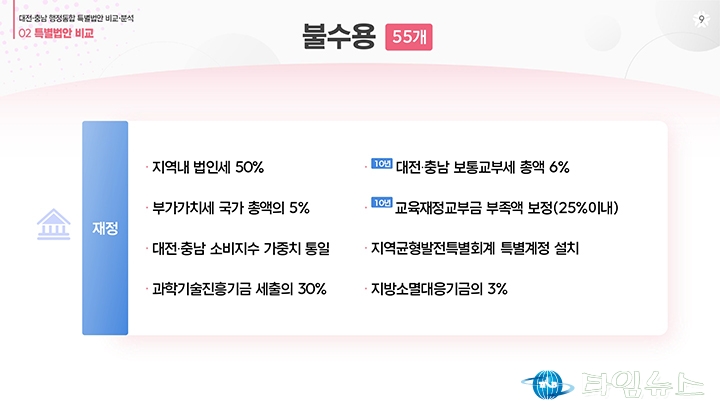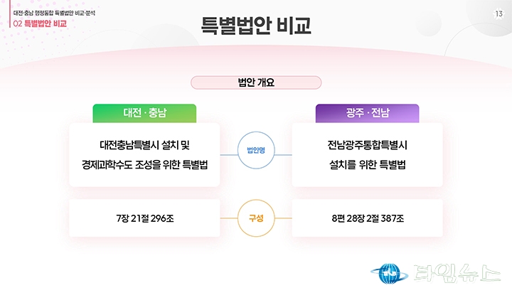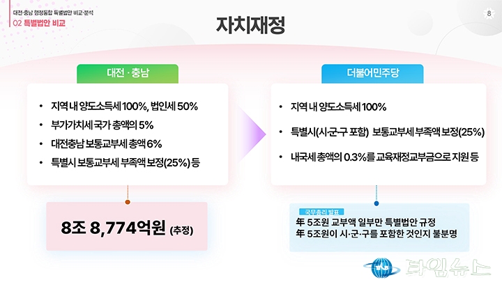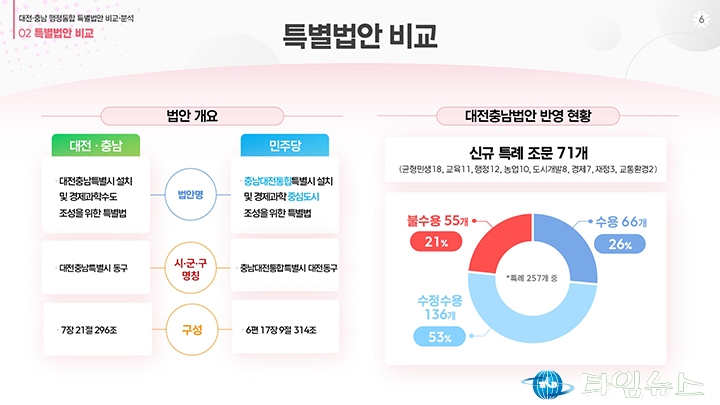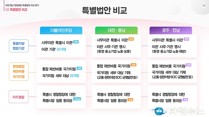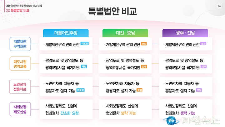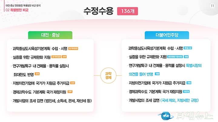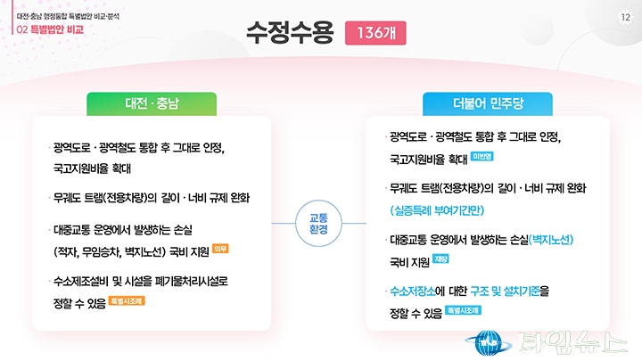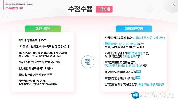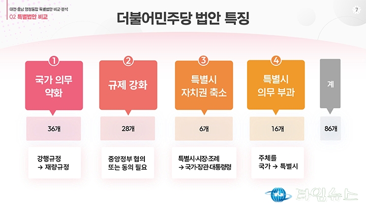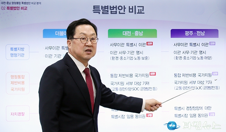 홈 / 정치 정치 이장우 대전시장, 비교표 들고 통합법 직격 “대통령 결단” 홍대인 기자 htcpone@naver.com 기사입력 2026-02-02 15:11:38 대전 [대전타임뉴스=홍대인 기자] 이장우 대전시장이 2월 2일 대전시청 브리핑룸에서 더불어민주당이 제출한 대전·충남 통합 특별법안을 강도 높게 비판하고 있다. 그는 법안 비교표를 직접 들어 보이며 기존 안과의 차이를 설명했고, 자치권과 재정권이 축소됐다고 강조했다. 이 시장은 대통령의 결단을 촉구하며 법안 수정을 요구했다. 홍대인 기자 홍대인 기자의 다른 기사 보기 → <저작권자 © 타임뉴스 무단전재 및 재배포 금지> 관련 기사 서철모 서구청장 예비후보, 선대위 출범…“서구 발전 역량 모았다” 2026.05.01 전문학 서구청장 예비후보·손도선 대전시의원 예비후보, 5일 합동 개소식…“기본사회 서구” 2026.05.01 맹수석 대전시교육감 예비후보 “학생 급식권·노동권 함께 지켜야” 2026.04.30 "정치 책임 물어야" vs "장관·총리 지낸 분이 할 말인가"... 대구시장 선거 '불꽃' 2026.04.30 李 대통령 "노조도 책임의식 가져야… 과도한 요구는 타 노동자에 피해" 2026.04.30 댓글 댓글 기능은 준비 중입니다.