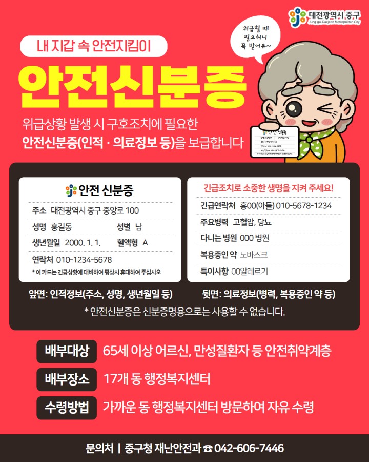 [대전타임뉴스=홍대인 기자] 대전 중구는 의료정보를 기재한 안전신분증 2000매를 제작해 각 동 행정복지센터를 통해 배부한다. 응급상황 시 현장 대응을 돕는 생활밀착 안전대책이다.