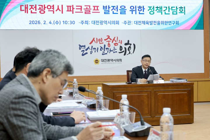 ‘대전체육발전을 위한 연구회’는 4일 시의회 소통실에서 「대전광역시 파크골프 발전을 위한 정책간담회」를 열었다. 간담회에는 시 관계 공무원과 5개 구 파크골프협회 관계자들이 참석했다.