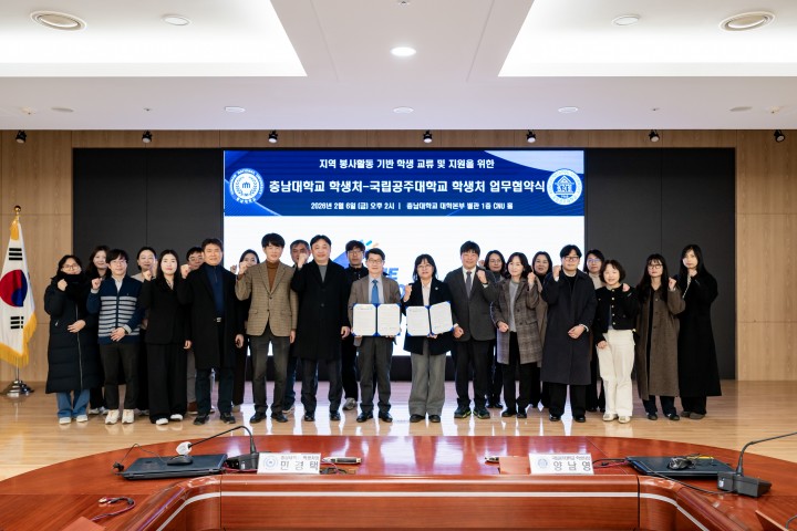 [대전타임뉴스=홍대인 기자] 충남대학교와 국립공주대학교는 6일 봉사활동을 기반으로 학생 참여형 교류 모델 구축을 위한 업무협약을 체결했다. 지역사회 기여를 강화하기 위한 협력이다. 협약식은 충남대 대학본부 별관 CNU홀에서 열렸다. 양 대학 학생처 관계자 20여 명이 참석했다. 양 기관은 지역 기반 봉사활동 정보 교류와 참여 협력을 추진한다. 봉사 프로그램 공동 개발과 공익 목적 복지 협력도 함께 진행한다. 학생 교류 프로그램 운영과 학생지원 분야 협력도 포함됐다. 봉사활동을 매개로 한 실질적 교류 모델을 마련하는 내용이다. 민경택 충남대 학생처장은 지역과 상생하는 성과를 지원하겠다고 밝혔다. 양남영 국립공주대 학생처장은 지속 가능한 협력 체계를 구축하겠다고 말했다.