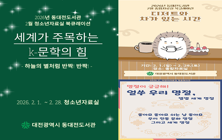[대전타임뉴스=홍대인 기자] 대전 동대전도서관이 2월 한 달간 자료실별 북큐레이션을 운영하며 주제 도서 40권을 전시한다. 연령대별 관심 주제와 최근 독서 경향을 반영한 전시다. 운영 기간은 2월 1일부터 28일까지다. 장소는 종합자료실, 청소년자료실, 어린이자료실 북큐레이션 코너다. 종합자료실은 ‘환상의 맛’을 주제로 디저트와 차를 다룬 도서 10권을 전시한다. 청소년자료실은 ‘세계가 주목하는 K-문학의 힘’을 주제로 한국 문학 관련 도서 10권을 선보인다. 어린이자료실은 ‘얼쑤 우리 명절, 별별 세계 명절’을 주제로 명절 문화를 소개하는 도서 10권을 전시한다. ‘이달의 작가’ 코너에서는 그림책 작가 에릭 칼의 작품 10권과 캐릭터 인형을 함께 만날 수 있다. 도서관 관계자는 “연령대별 이용자가 관심 있는 주제로 책과 자연스럽게 만날 수 있도록 기획했다"며 “독서 문화 확산에 기여하겠다"고 말했다.