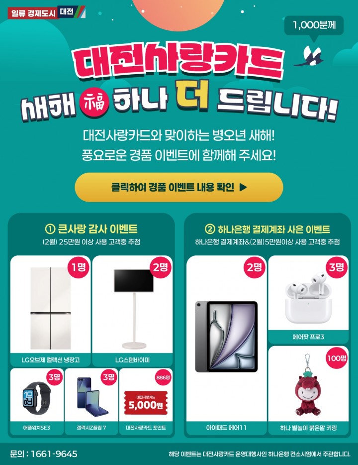 2월 한 달 동안 대전사랑카드를 25만 원 이상 사용한 고객 중 추첨을 통해 1등 냉장고, 2등 스탠드형 TV 등 경품을 제공한다.