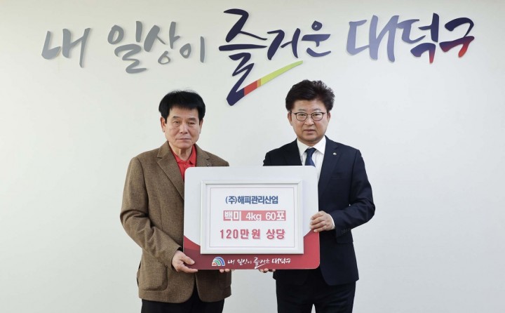 [대전타임뉴스=홍대인 기자] 대전 대덕구가 선물세트 28개와 백미 60포를 기탁받아 취약계층에 전달한다. 대덕구는 9일 구청 구민의사랑방에서 사단법인 국제휴먼클럽으로부터 선물세트 28개, 300만 원 상당을 기탁받았다고 밝혔다. 같은 날 ㈜해피산업관리로부터 백미 4kg 60포, 120만 원 상당도 기탁받았다. 기탁된 선물세트는 드림스타트 사례관리 대상 20세대와 오정동 어려운 이웃 8세대에 전달된다. 백미는 저소득 청·중장년 고독사 위험 가구에 지원될 예정이다. 백은기 국제휴먼클럽 총재는 “어려운 이웃에게 작은 정성을 전할 수 있어 뜻깊다"고 말했다. 윤병식 해피산업관리 대표는 “따뜻한 명절에 도움이 되길 바란다"고 말했다. 구 관계자는 “기탁 물품이 취약계층 가정에 잘 전달되도록 세심히 살피겠다"고 말했다.