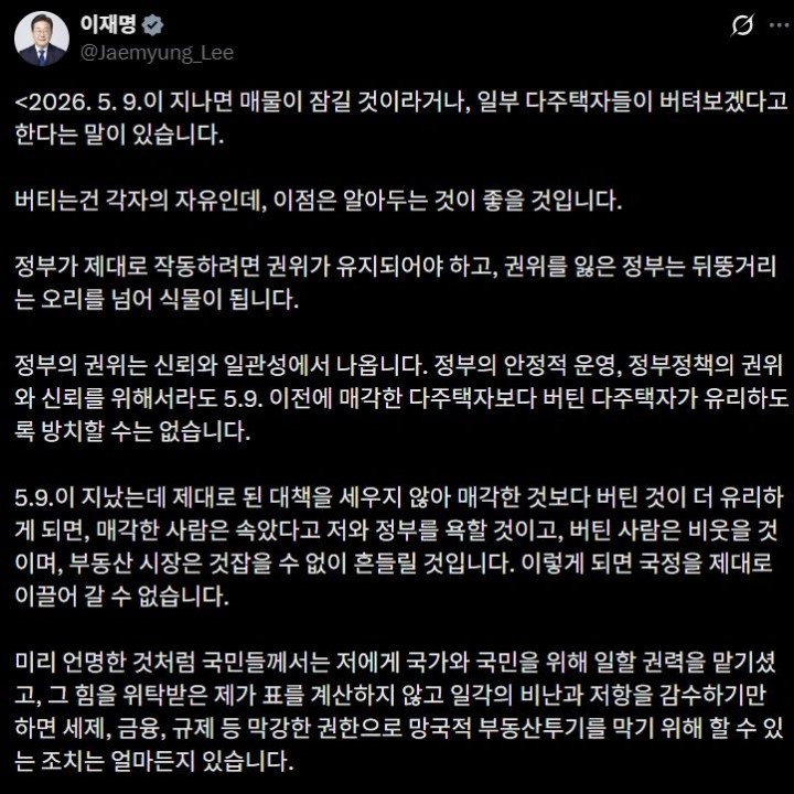 이 대통령은 "버티는 것은 개인의 자유지만, 권위를 잃은 정부는 식물 정부나 다름없다"며 "정책을 믿고 따라준 사람보다 끝까지 버틴 다주택자가 유리해지도록 방치하는 일은 절대 없을 것"이라고 강조했다.