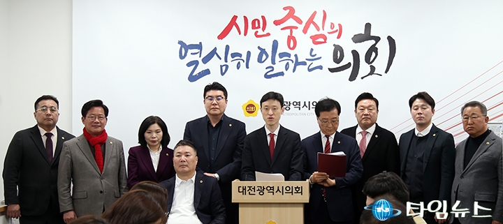 [대전타임뉴스=홍대인 기자] 대전시의회 의장단과 상임위원장 등 국민의힘 의원들이 27일 ‘병오7적’ 규탄 기자회견을 열고 민주당의 대전·충남 행정통합 추진을 정면 반박했다. 이날 오후 2시 시의회 기자실에서 열린 회견에서 국민의힘 의원들은 “대전 팔아먹는 민주당 병오7적을 규탄한다"고 밝혔다. ‘병오7적’은 2026년 병오년을 들어 대전 지역 민주당 국회의원 7명을 겨냥해 사용한 정치적 표현이라고 설명했다. 이들은 “시민의 애향심이 행정통합법의 졸속·날치기 통과 시도를 저지했다"며 “시민 뜻에 따른 대전시와 시의회의 결정을 민주당이 연일 비난하고 있다"고 주장했다. 이어 민주당을 향해 “일신영달과 선거에만 관심 있다"고 비판했다. 특히 민주당 측이 이장우 대전시장과 김태흠 충남지사를 ‘매향노’ 등으로 표현한 데 대해 강하게 반발했다. 국민의힘 의원들은 “지금 누가 매향을 하고 있는지 되묻고 싶다"며 “대전에 무엇이 이익이 되는지 명확히 보장하지 못하고 있다"고 주장했다. 이들은 민주당 법안의 구체성 부족도 문제 삼았다. “최대 20조 지원 등 선언적 구호만 있을 뿐 대전에 어떤 실익이 있는지 설명이 없다"며 “시민이 예측할 수 있도록 구체적으로 설명하고 설득하라"고 요구했다. 또 “통합에 반대하며 숙의와 주민투표를 요구하는 시민 목소리를 무시하고 있다"며 절차적 정당성을 강조했다. 이어 “대전의 이익을 위해 정부를 설득하는 정치에 나서라"고 촉구했다. 조원휘 대전시의회 의장은 질의응답에서 “행정통합은 매우 복잡한 사안"이라며 “충분한 시간과 실질적 재정권·자치권 보장이 담보된 안으로 추진해야 한다"고 말했다. 그는 “주민투표로 시민 뜻을 확인하는 것이 우선"이라고 강조했다. 국민의힘 측은 주민투표 결과 찬성이 높게 나올 경우 통합 추진 자체를 반대하지는 않겠다는 입장도 밝혔다. 한 참석 의원은 “주민투표에서 찬성이 높으면 어떤 법안이든 그 뜻을 존중해야 한다"고 말했다. 시의회 국민의힘은 법안 재상정 등 상황 변화가 있을 경우 추가 대응에 나서겠다고 밝혔다. 대전·충남 행정통합을 둘러싼 여야 공방은 당분간 이어질 것으로 보인다.