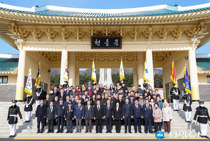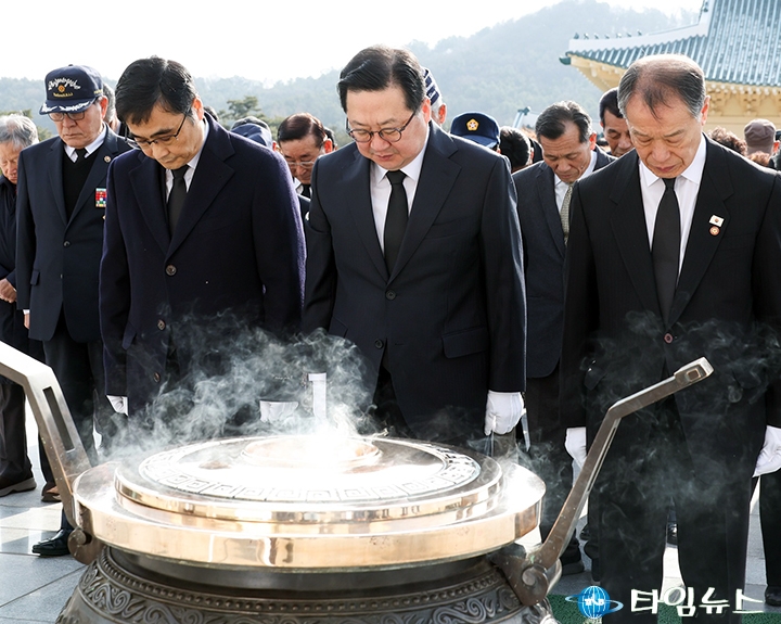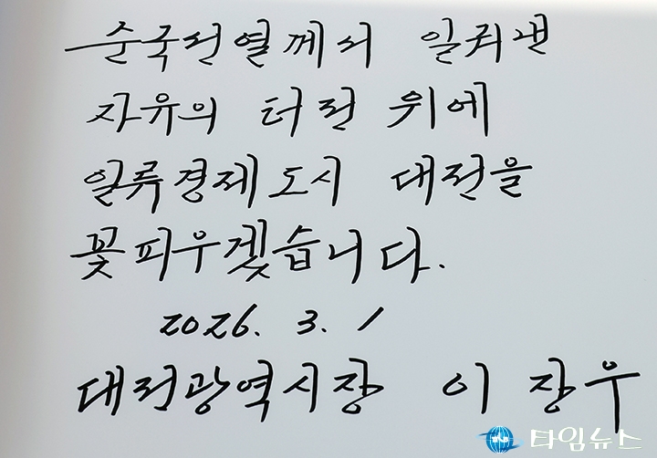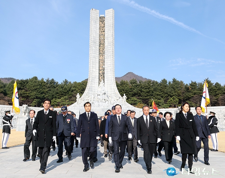 [대전타임뉴스=홍대인 기자] 이장우 대전시장이 제107주년 3·1절을 맞아 1일 오전 국립대전현충원을 찾아 순국선열과 호국영령을 참배했다. 이날 참배에는 양준영 광복회 대전시지부장과 오재덕 대전지방보훈청장, 보훈단체장, 독립유공자 유가족 등 80여 명이 함께했다. 이 시장은 “107년 전 우리 민족이 태극기를 들고 대한독립을 외쳤던 그날을 다시 새긴다"며 “순국선열의 열망으로 얻은 자유를 소중히 지켜나가겠다"고 말했다. 또한 방명록에 “순국선열께서 일궈낸 자유의 터전 위에 일류경제도시 대전을 꽃피우겠습니다"라고 남겼다.
