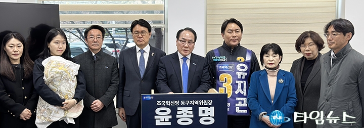 [대전타임뉴스=홍대인 기자] 윤종명 조국혁신당 대전 동구 지역위원장이 3일 동구청장 선거 출마를 공식 선언했다. 윤 위원장은 이날 대전시의회에서 기자회견을 열고 “정치 인생 마지막 도전으로 동구 발전을 위해 유종의 미를 거두겠다"며 출마 의지를 밝혔다. 이어 “거대 양당 정치에 휘둘리지 않는 실용·개혁 행정으로 동구의 새로운 길을 열겠다"고 말했다. 그는 “조국혁신당 동구 지역위원장으로 혁신의 선명성과 합리적 균형추 역할을 분명히 하겠다"며 “권력에는 단호하게, 행정에는 실용적으로, 지역에는 오직 주민 이익만을 기준으로 삼겠다"고 지지를 호소했다. 동구 발전 구상도 제시했다. 윤 위원장은 “대전의 관문인 복합터미널과 대전역을 품은 동구는 충청권 교통·물류·창업 전략 거점"이라며 대전역 중심 역세권과 판암·용운·가양·삼성 일대 주거지, 식장산과 대청호 자연 환경을 핵심 축으로 제시했다. 대전·충남 행정통합에 대해서는 조건부 대응 입장을 밝혔다. 그는 “통합이 거스를 수 없는 흐름이라면 통합 이후 동구가 무엇을 얻는지가 더 중요하다"며 “공공기관 이전 동구 우선 배치, 통합 재정 배분 구조 속 동구 몫 확보, 낙후 원도심 특별 지원 제도 명문화로 또 다른 소외가 발생하지 않도록 하겠다"고 강조했다. 윤 위원장의 출마 선언으로 대전 동구청장 선거 경쟁 구도도 본격화될 전망이다.