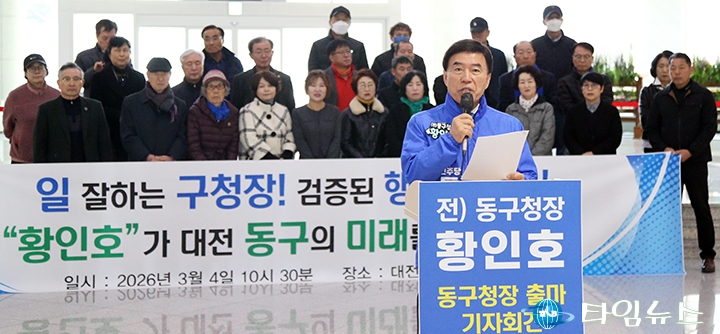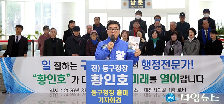 [대전타임뉴스=홍대인 기자] 황인호 전 동구청장이 “멈춰선 동구의 엔진을 다시 가동하겠다"며 6·3 지방선거 대전 동구청장 선거 출마를 선언했다. 황 전 청장은 4일 오전 대전시의회 로비에서 기자회견을 열고 “무거운 책임감과 동구 발전을 위한 뜨거운 열정을 갖고 이 자리에 섰다"며 “오는 6월 3일 지방선거에서 제10대 대전 동구청장 출마를 엄숙히 선언한다"고 밝혔다. 그는 “위기의 동구는 이제 멈출 시간이 없다"며 “대전역세권 개발, 노후 도심 재개발과 재건축, 대전시립의료원 건립, 산내 평화공원 등 동구의 지도와 역사를 바꿀 사업들이 추진력을 잃고 있다"고 말했다. 이어 “동구는 대전·충남 통합 논의 속에서 충청권 메가시티 핵심 거점으로 도약할지 정체될지 중대한 기로에 서 있다"며 “행정은 이론이 아니라 실전이며 결과로 증명해야 한다"고 강조했다. 황 전 청장은 구의원과 시의원, 민선7기 동구청장을 지낸 경험을 언급하며 “동구의 골목골목을 누구보다 잘 아는 사람"이라며 “공백기 동안에도 동구의 미래 100년 먹거리를 설계해 왔다"고 밝혔다. 특히 역세권 활성화를 연구한 박사학위 논문을 언급하며 “대전역을 단순히 스쳐 지나가는 곳이 아니라 사람이 모이고 돈이 도는 ‘해가 지지 않는 경제 거점’으로 만들 구체적인 설계를 마쳤다"고 말했다.