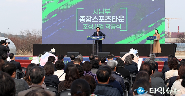 [대전타임뉴스=홍대인 기자] 조원휘 대전시의회 의장이 5일 유성구 용계동 서남부종합스포츠타운 착공식에서 “15년 만에 착공식을 갖게 됐다"고 말했다. 조 의장은 “서남부 스포츠타운은 1조 437억 원 예산이 들어가며 2029년 완공을 목표로 한다"고 밝혔다. 조 의장은 “이 사업은 2,136억 원 정도는 대전시에서 투입하고, 나머지 8,300억 원 정도는 대전 출자기관인 도시공사가 직접 시행한다"고 말했다. 그는 “민자를 유치해 하는 것보다 훨씬 빠르게 공사가 진행될 것"이라고 했다. 조 의장은 “종합스포츠타운이 건립됨으로써 유성 서남부 쪽에 획기적인 발전의 전기를 마련했다고 생각한다"고 말했다. 나노반도체 산업단지 추진 상황에 대해서는 “무산됐다, 어렵다 가짜뉴스가 굉장히 많다"고 말했다. 조 의장은 “입주 기업들과 MOU를 직접 체결했고, 면적의 44%는 들어오겠다는 MOU를 서류로 작성한 기업들이 있다"고 밝혔다. 조 의장은 “둔곡 과학비즈니스벨트 둔곡 지역에는 독일 다국적 제약회사 머크가 4,300억 원을 투자해 아시아 본부 사옥을 짓고 있다"고 말했다. 그는 “6월 말 안에 완공될 것이고, 1차적으로 약 300명 이상의 고용 창출을 할 것"이라고 했다.