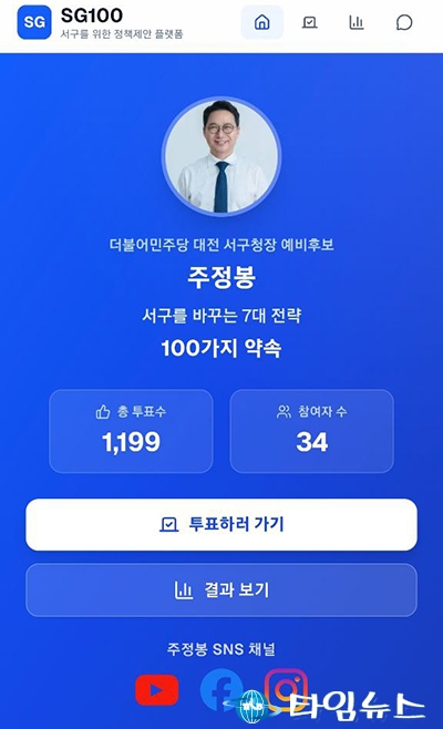 [대전타임뉴스=홍대인 기자] 주정봉 대전 서구청장 예비후보가 선거 과정에서 시민 의견을 수렴하는 온라인 정책 제안 플랫폼 ‘SG100’을 개설해 운영한다. 주 후보는 5일 주민들과의 쌍방향 소통을 강화하기 위해 정책 제안 플랫폼 ‘SG100’을 공개했다고 밝혔다. ‘SG’는 ‘서구(Seo-gu)’의 영문 약자로, 플랫폼에는 주 후보가 정책서에서 제시한 ‘서구를 바꾸는 100가지 약속’을 기반으로 한 정책 공약이 담겼다. 플랫폼에는 주민주권시대 AI 스마트 행정, 혁신 경제, 균형 성장, 사회 안전망 강화, 교육 혁신, 청년도시, 과학문화 도시 등 7대 전략과 이를 실행하기 위한 100개 정책 과제가 제시됐다. 시민들은 PC나 모바일에서 QR코드를 통해 플랫폼에 접속해 공약에 대해 ‘좋아요’로 지지를 표시하거나 지역 개선 의견을 자유롭게 남길 수 있으며 작성 의견은 익명으로 처리된다. 주정봉 후보는 “선거 슬로건인 ‘주민이 주인, 행복한 서구’를 실현하기 위한 실행 방안"이라며 “시민 의견에 대해 일정 시점에 피드백을 하는 등 경청과 쌍방향 소통에 최선을 다하겠다"고 말했다. 이어 “이번 정책 제안 플랫폼은 민선 9기 선거를 앞두고 시민 제안과 쌍방향 소통 채널로서는 사실상 처음 시도되는 방식"이라며 시민들의 관심과 참여를 당부했다.