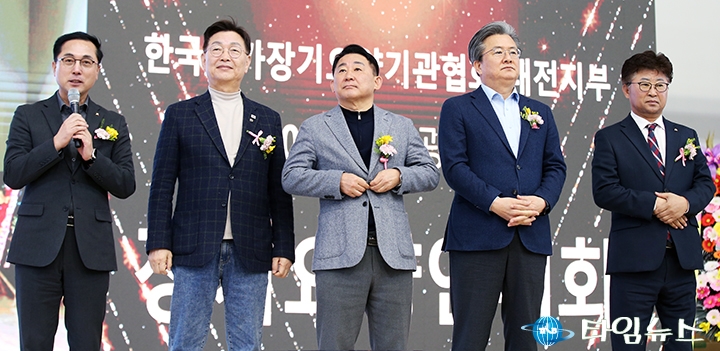 박희조 동구청장·김제선 중구청장·서철모 서구청장·정용래 유성구청장·최충규 대덕구청장이 7일 대전대학교 맥센터에서 열린 ‘2026년 장기요양인대회’에서 축사를 하고 있다