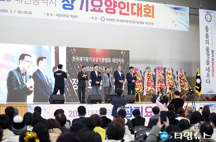 [대전타임뉴스=홍대인 기자] 박희조 대전 동구청장이 7일 대전대학교 맥센터에서 열린 ‘2026년 장기요양인대회’에서 대전 5개 구청장을 대표해 축사를 하고 장기요양 종사자들의 헌신에 감사의 뜻을 전했다. (사)한국재가장기요양기관협회 대전지부가 주관한 이날 행사에는 장기요양기관 종사자와 관계자 등 약 1500명이 참석했다. 행사에서는 장기요양 서비스 발전에 기여한 종사자들을 대상으로 유공자 표창이 진행됐다. 박 청장은 축사에서 대전 5개 구청장을 대표해 인사를 전하며 장기요양 종사자들의 노고에 감사의 뜻을 밝혔다. 그는 “앞서 이장우 시장과 조원휘 의장이 장기요양 종사자들의 역할과 헌신에 대해 말씀해 주셨다"며 “저 역시 같은 마음으로 여러분께 깊은 감사의 말씀을 드린다"고 말했다. 이어 “여러분의 따뜻한 손길과 고귀한 눈빛이 어르신들의 삶을 지탱하고 있다"며 “장기요양 종사자들의 헌신적인 돌봄 덕분에 어르신들의 노후가 더욱 따뜻해지고 삶의 질이 높아지고 있다고 생각한다"고 밝혔다. 박 청장은 “대전 5개 구청장 모두 같은 마음으로 장기요양 종사자 여러분께 감사의 뜻을 전하고 있다"며 “여러분의 헌신적인 돌봄이 어르신들의 삶을 지키고 지역사회를 지탱하는 힘이 되고 있다"고 강조했다. 이어 “오늘 하루만큼은 현장에서 쌓인 피로와 스트레스를 내려놓고 서로 격려하며 즐거운 시간을 보내길 바란다"며 “어르신 돌봄을 위해 헌신하는 여러분께 다시 한 번 깊이 감사드린다"고 말했다.