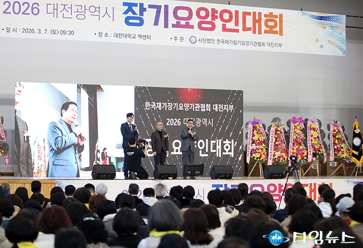 [대전타임뉴스=홍대인 기자] 박범계 국회의원(더불어민주당, 대전 서구을)은 7일 대전대학교 맥센터에서 열린 ‘2026년 장기요양인대회’에서 “요양보호사는 존엄한 노후를 지키는 수호천사"라며 장기요양 종사자들의 헌신에 감사와 응원의 뜻을 전했다. (사)한국재가장기요양기관협회 대전지부가 주관한 이날 행사에는 장기요양기관 종사자와 관계자 등 약 1500명이 참석했다. 행사에서는 장기요양 서비스 발전에 기여한 종사자들을 대상으로 유공자 표창이 진행됐다. 박 의원은 축사에서 “대전에는 약 900개의 장기요양기관과 2만5000여 명의 요양보호사와 종사자들이 활동하고 있다"며 “여러분은 어르신들의 존엄한 노후를 지키는 수호천사"라고 말했다. 이어 “현장에서 묵묵히 헌신하는 여러분께 깊이 감사드리며 힘찬 응원의 박수를 보낸다"고 밝혔다.