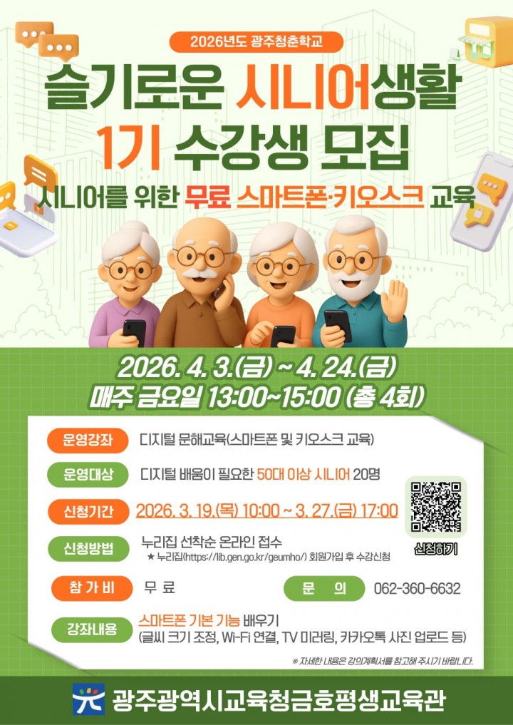 금호평생교육관 정운용 관장은 “이번 교육이 디지털 환경에 익숙하지 않은 시니어들의 문해 능력을 높이고 일상의 편리함을 되찾는 계기가 되길 바란다"며 “시니어들의 많은 관심과 참여를 바란다"고 말했다.1기 수강 신청은 오는 19일 오전 10시부터 27일 오후 5시까지 금호평생교육관 누리집에서 하면 된다. 2~4기 교육 신청은 순차적으로 모집한다.