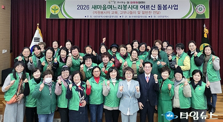 [대전타임뉴스=홍대인 기자] 새마을지도자대전광역시부녀회는 10일부터 시작한 ‘2026 새마을며느리봉사대 어르신 돌봄 자원봉사자 교육’을 대전 5개 자치구에서 진행해 총 246명이 교육을 수료했다고 밝혔다. 이번 교육은 어르신 돌봄 자원봉사자의 역량 강화를 위해 마련됐다. 교육은 대전과학기술대학교 사회복지학과 변상록 교수가 ‘AI시대, 새마을봉사가 만드는 행복한 삶과 우울 극복’을 주제로 진행했다. 첫 교육은 3월 10일 동구새마을회관에서 48명이 참여했다. 같은 날 한국효문화진흥원 드림홀에서 중구 51명, 11일 서구복수동행정복지센터에서 서구 72명, 유성구새마을회 지하회의실에서 유성구 39명이 교육을 받았다. 마지막으로 13일 대덕구새마을회관에서 36명이 참여하며 전체 교육이 마무리됐다. ‘새마을며느리봉사대 어르신 돌봄사업’은 대전 82개 동 새마을부녀회원 246명이 독거 어르신과 1대1 결연을 맺고 1년 동안 정기 방문, 안부 확인, 밑반찬 나눔, 나들이 활동 등을 진행하는 사업이다. 남희수 새마을지도자대전광역시부녀회 회장은 교육 취지를 설명하며 “어르신들이 혼자가 아니라는 메시지를 전할 수 있도록 봉사를 이어가겠다"고 말했다.