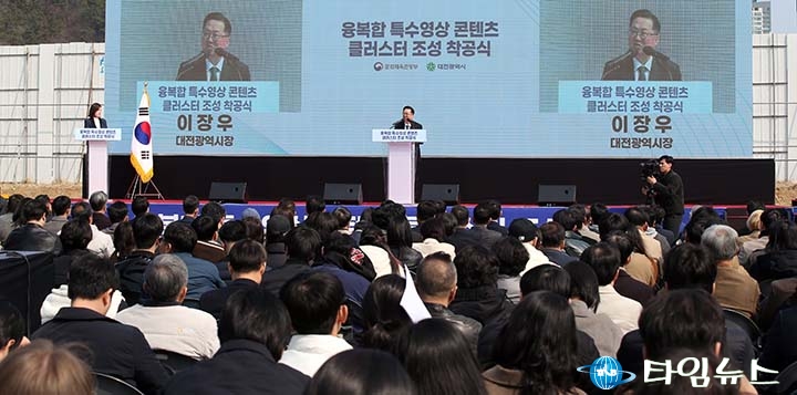[대전타임뉴스=홍대인 기자] 대전시는 11일, 유성구 도룡동 옛 대전관광공사 부지에서 총사업비 1,690억 원이 투입되는 ‘융복합 특수영상 콘텐츠 클러스터’ 건립 공사를 시작했다. 이장우 대전시장은 “대전을 대한민국 특수영상 산업의 수도로 만들겠다"고 밝혔다. 이날 착공식에는 이 시장을 비롯해 주요 기관 관계자와 영상기업 대표, 시민 등 약 200명이 참석했다. 사업은 지하 1층, 지상 8층, 연면적 3만3,528㎡ 규모로 조성되며 2028년 10월 준공, 2029년 상반기 개관을 목표로 추진된다. 클러스터에는 전문 스튜디오 5개실과 특수영상 기업 입주공간 80개실, 교육시설과 전시·체험 공간 등이 들어선다. 국비 772억 원과 시비 918억 원이 투입된다. 이 시장은 착공식에서 대전이 특수영상 산업 중심 도시로 성장할 수 있는 기반을 갖추고 있다고 강조했다.