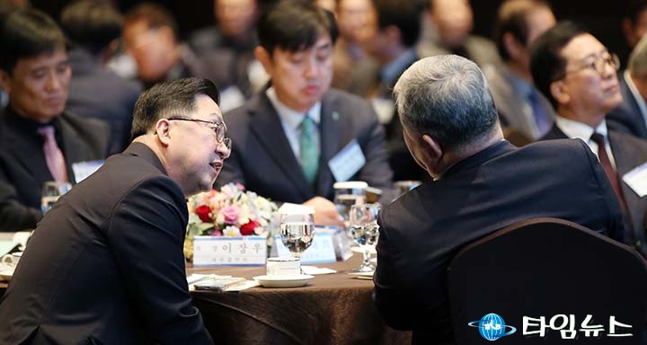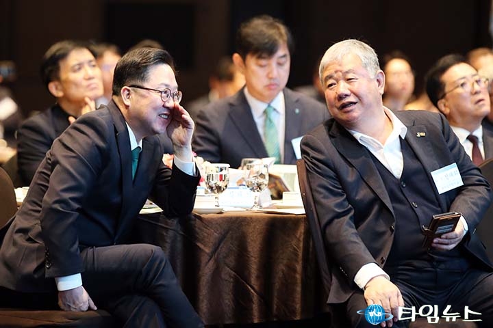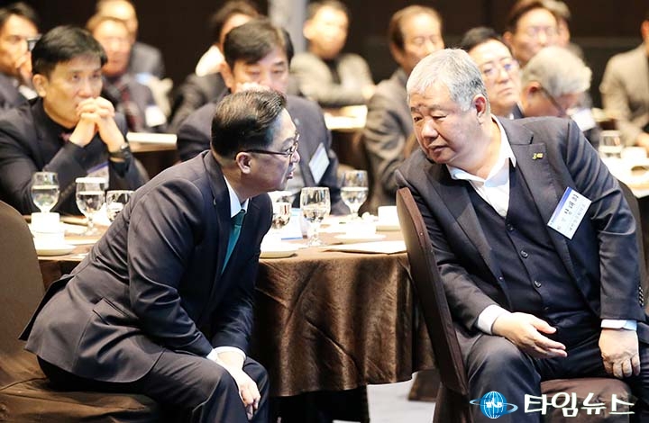 [대전타임뉴스=홍대인 기자] 이장우 대전시장과 정태희 대전상공회의소 회장이 12일 대전 호텔ICC에서 열린 제257차 대전경제포럼 조찬세미나에서 환담을 나누고 있다. 정태희 회장은 인사말에서 “이번 토요일 대전하나시티즌 경기가 있다"며 “상공회의소 회원들에게 50% 할인도 제공되는 만큼 CEO들이 가족과 함께 경기장을 찾아 4만 석을 채워 대전의 기운을 살려주길 바란다"고 말했다. 이장우 시장도 “대전하나시티즌은 대전을 대표하는 구단이자 우리의 자산"이라며 “지난해 준우승을 했지만 관심이 야구에 쏠렸다. 올해는 우승을 목표로 시민들의 응원이 필요하다"고 말했다.