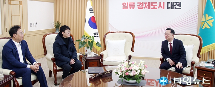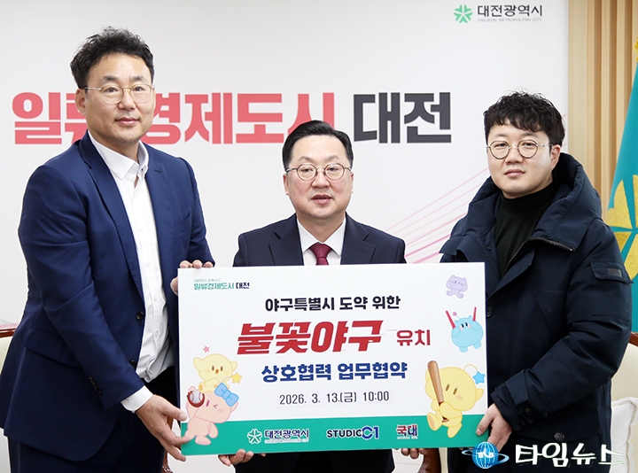 [대전타임뉴스=홍대인 기자] “한화이글스의 선전, KBO 올스타전 유치, 류현진배 중학야구대회 신설에 이어 ‘불꽃야구2’ 유치까지 더해지면서 대전은 명실상부한 야구특별시로 자리매김하고 있다." 이장우 대전시장이 13일 시청 응접실에서 열린 ‘불꽃야구2’ 유치 업무협약식에서 이같이 선언했다. 취임 이후 야구특별시 대전을 핵심 도시 브랜드로 직접 진두지휘해온 이 시장이 이번 협약까지 직접 챙기며 야구도시 대전 완성에 강한 의지를 드러냈다. 이 시장은 “한밭야구장이라는 대전 야구의 성지가 새로운 이름과 콘텐츠로 다시 불타오를 수 있도록 적극 지원해 나가겠다"고 강조하며 “야구를 통해 대전을 찾는 사람들이 늘어날수록 지역 경제도 함께 살아난다"고 덧붙였다. 이날 대전시는 스튜디오 C1, ㈜국대와 함께 ‘불꽃야구2’ 유치 및 한밭야구장 우선 사용에 관한 3자 업무협약을 체결했다. 이장우 시장과 스튜디오 C1 장시원 PD, ㈜국대 김원석 회장 등이 참석했다.