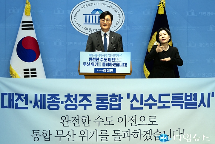 [대전타임뉴스=홍대인 기자] 대전·충남 행정통합이 무산 위기에 처한 가운데, 더불어민주당 장철민 국회의원(대전 동구)이 대전·세종·청주를 통합해 대한민국의 완전한 수도로 만드는 ‘신수도특별시’ 창설 구상을 전격 발표했다. 특히 “서울특별시는 수도의 지위를 내려놓고 서울광역시로 전환해야 한다"는 파격 발언까지 내놓으며 충청 정치권의 이목을 집중시켰다. 장 의원은 13일 오전 국회 소통관에서 긴급 기자회견을 열고 통합 무산에 대한 대안으로 ‘대한민국 개조 플랜B’를 발표했다. 대전시장 출마 예정자인 장 의원이 기존 통합 논의를 뛰어넘는 거대 비전을 꺼내 들며 차별화 전략을 본격화한 것이다. 장 의원은 12일 본회의에서 대전·충남 통합안이 끝내 처리되지 못한 것에 대해 “진심으로 송구하다"며 대전 시민들에게 사과했다. 이어 “이장우 대전시장, 김태흠 충남지사 등 국민의힘 지자체장들의 재선 욕심이 우리의 미래를 가로막았다"고 강하게 비판했다. 민주당에 대해서도 “국민의힘의 발목 잡기를 돌파하는 정치력을 발휘하지 못했다"며 자성의 목소리를 냈다. 장 의원이 제시한 첫 번째 핵심 프로젝트는 ‘신수도특별시’ 창설이다. 대전·세종·청주를 통합해 인구 270만 명 규모의 완전한 대한민국 수도를 만들겠다는 구상이다. 장 의원은 “세종만의 반쪽짜리 행정수도가 아니라 경제·문화·정치 기능이 모두 이전하는 온전한 수도 이전이어야 한다"며 “수도권 집중을 획기적으로 타파하기 위해 서울특별시는 수도의 지위를 내려놓고 서울광역시로 전환해야 한다"고 강조했다. 반도체·바이오·방산의 첨단 산업 인프라와 국토 정중앙이라는 지리적 위치를 강점으로 꼽으며 “500만 인구 도시 규모의 메가시티가 되기에 이미 충분하다"고 역설했다. 두 번째 프로젝트는 ‘충청특별자치도’ 승격이다. 통합 신수도를 제외한 충남과 충북의 나머지 지역을 하나로 묶어 경기도를 대체할 새로운 배후 수도권으로 만들겠다는 계획이다. 세 번째는 ‘충청권산업투자공사’ 설립이다. 3조 원 규모의 자본을 투입해 초광역 단위 경제권 통합을 이끌 지역 산업 컨트롤타워를 만드는 것으로, 장 의원은 이를 ‘충청판 산업은행’으로 명명했다. 장 의원은 이미 작년 4월 관련 법안을 대표 발의한 바 있다. 장 의원은 구체적인 실행 로드맵도 제시했다. 그는 “제가 대전시장이 된다면 내년 하반기에 대전·세종·청주 통합에 대한 주민투표를 전격 실시하겠다"며 “당선 이후 1년 동안 철저히 준비하고 설득해 2028년 총선과 함께 모두가 동의하는 행정통합을 기필코 이뤄내겠다"고 약속했다. 장 의원은 “낡은 리더들의 자리싸움으로 대전이 망가지는 것을 막고 완전한 수도 이전과 국가 개조라는 거대한 비전으로 뚜벅뚜벅 걸어가 반드시 해내겠다"며 “이재명은 합니다. 저 장철민도 반드시 해냅니다"라고 강한 결기를 보이며 기자회견을 마쳤다.