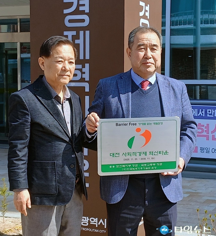 [대전타임뉴스=홍대인 기자] 대전일자리경제진흥원은 대전사회적경제혁신타운이 ‘장애물 없는 생활환경’을 의미하는 BF 인증을 획득하고 13일 인증 현판식을 개최했다고 밝혔다. BF 인증은 장애인과 노인, 임산부 등 이동약자를 포함한 시민이 시설을 안전하고 편리하게 이용할 수 있도록 접근성과 이동 편의성, 안전성을 평가해 부여하는 제도다. 대전사회적경제혁신타운은 설계와 공사 단계부터 인증 기준을 반영해 자동문 설치와 점자 안내판 확충 등 편의시설을 보완하고 공용공간 접근성을 개선했다. 그 결과 2025년 11월 20일 BF 인증을 획득했다. 이번 현판식은 인증 현판을 부착해 시설이 차별 없는 공공서비스 환경을 갖추었음을 알리기 위해 마련됐다. 최창우 대전일자리경제진흥원장은 “BF 인증 획득을 통해 혁신타운이 모든 시민이 이용할 수 있는 포용적 공간으로 발전하게 됐다"며 “사회적경제기업 성장 지원과 함께 시민 누구나 편리하게 이용할 수 있는 시설 운영에 노력하겠다"고 말했다.