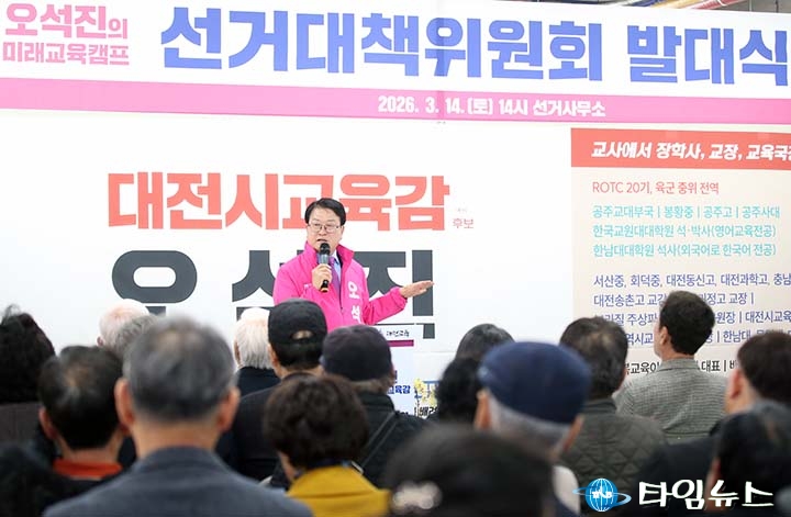 홈 / 정치 정치 오석진 대전시교육감 예비후보 “사람 키우는 교육”…대전교육 변화 시작 홍대인 기자 htcpone@naver.com 기사입력 2026-03-15 00:19:27 대전 [대전타임뉴스=홍대인 기자] 오석진 대전시교육감 예비후보가 14일 대전 서구 용문동 태산빌딩 선거사무소에서 열린 선거대책위원회 발대식에서 인사말을 하고 있다. 오석진 예비후보는 “대전교육 변화를 시작하는 출발점"이라며 “학생들이 인간답게 성장할 수 있는 교육 환경을 만들겠다"고 말했다. 홍대인 기자 홍대인 기자의 다른 기사 보기 → <저작권자 © 타임뉴스 무단전재 및 재배포 금지> 관련 기사 서철모 서구청장 예비후보, 선대위 출범…“서구 발전 역량 모았다” 2026.05.01 전문학 서구청장 예비후보·손도선 대전시의원 예비후보, 5일 합동 개소식…“기본사회 서구” 2026.05.01 맹수석 대전시교육감 예비후보 “학생 급식권·노동권 함께 지켜야” 2026.04.30 "정치 책임 물어야" vs "장관·총리 지낸 분이 할 말인가"... 대구시장 선거 '불꽃' 2026.04.30 李 대통령 "노조도 책임의식 가져야… 과도한 요구는 타 노동자에 피해" 2026.04.30 댓글 댓글 기능은 준비 중입니다.