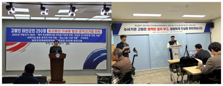 [2026년 3월 3일 좌측: 오전 10시 충남도청 김세호 전 군수 대책위 고발 수사촉구 VS 우측: 같은 날 오후 4시 태안군청 브리핑 룸 반박 기자회견]