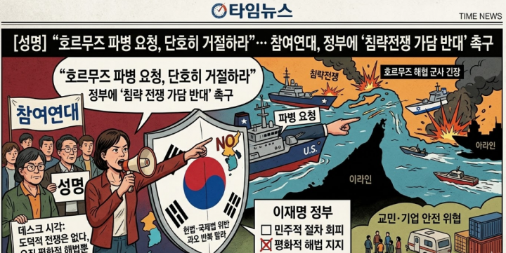 참여연대 평화군축센터는 성명을 통해 이란 호르무즈 해협 봉쇄 대응을 명분으로 한 군사 개입은 우리 헌법과 국제법을 정면으로 위반하는 행위이며, 한반도 안보에도 심각한 위협이 될 것이라고 경고했다.