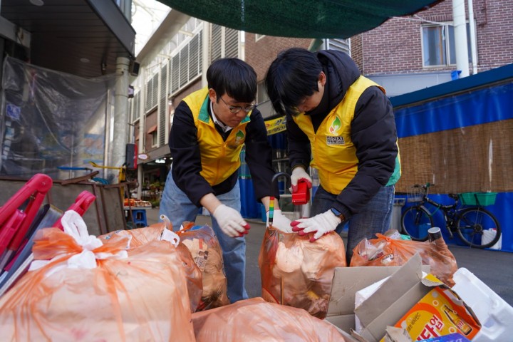 ▲지난 12일 신천지 자원봉사단 광주지부 봉사자들이 말바우시장 인근에 방치된 생활 쓰레기를 수거하고 있다.(사진제공=신천지 자원봉사단 광주지부)
