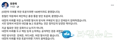 [대전타임뉴스=홍대인 기자] 더불어민주당 대전시장 출마 예정자인 장철민 국회의원(더불어민주당, 대전 동구)이 18일 충청권 통합 방안 토론회를 제안하며 경선 경쟁에 불을 붙였다. 장 의원은 이날 대전시의회 기자회견에서 “대전·충남 행정통합 무산 이후 시민들에게 대안과 비전을 제시해야 할 책임이 있다"고 밝혔다. 그는 “대전·세종·청주 통합 ‘신수도특별시’와 ‘충청특별자치도’ 구축을 제시했고 2028년 출범을 위해 시장 임기 단축도 약속했다"고 말했다. 이어 “다른 후보들의 입장이 나오지 않고 있다"며 “시민 앞에서 비전과 대안을 제시해야 한다"고 강조했다. 토론 방식과 관련해 “충청 통합 방안만을 주제로 별도 토론회를 열자"며 “일정과 형식은 두 후보 뜻에 따르겠다"고 제안했다. 이에 장종태 국회의원(대전 서구갑)은 같은 날 SNS를 통해 “대전의 미래를 위한 토론이라면 언제든 참여하겠다"며 참여 의사를 밝혔다.