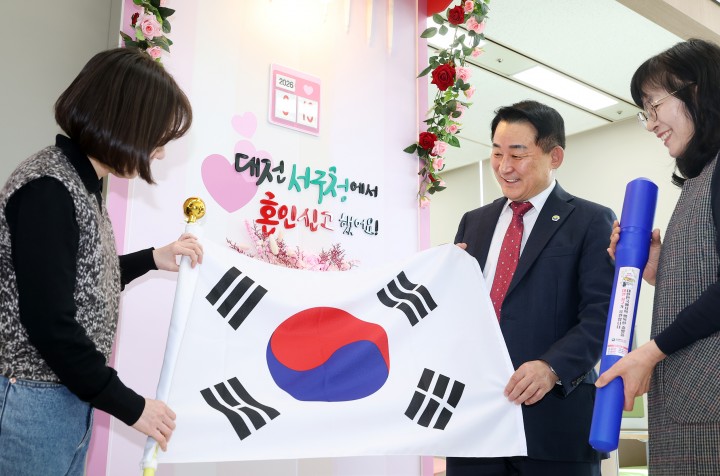 [대전타임뉴스=홍대인 기자] 대전 서구는 혼인신고를 위해 구청을 방문한 국제결혼 부부에게 태극기를 증정한다고 20일 밝혔다. 증정 대상은 국제결혼 신혼부부다. 태극기와 국기함, 깃대, 깃봉으로 구성된 세트를 제공한다. 사업은 신혼부부 출발 축하와 국기 게양 문화 확산을 위해 추진됐다. 혼인신고 포토존 즉석 사진 촬영 서비스도 함께 운영한다. 서구에 따르면 2025년 혼인 3105건 중 국제결혼은 127건으로 약 4%를 차지한다. 서구는 국제결혼 가정의 지역 정착 지원을 강화하겠다고 밝혔다.