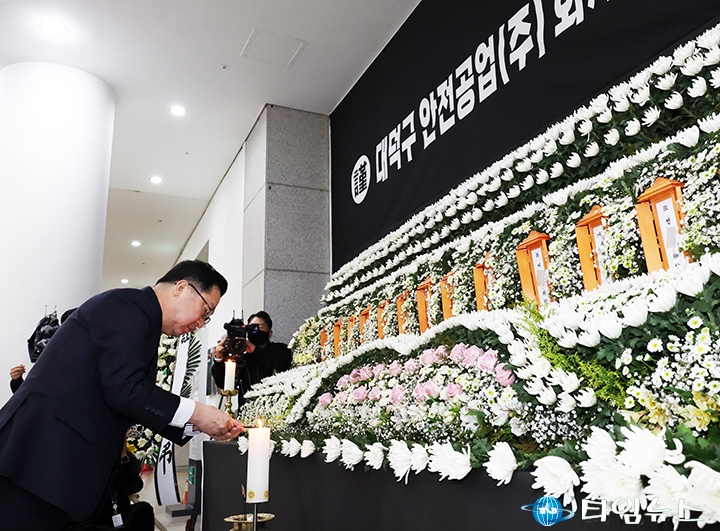 [대전타임뉴스=홍대인 기자] 이장우 대전시장이 22일 문평동 화재 사고 희생자 합동분향소를 찾아 참배하고 유가족 지원 상황을 점검했다.