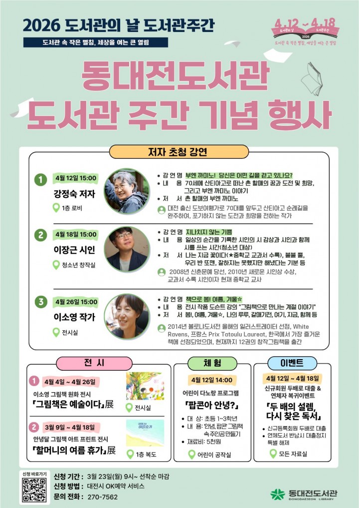 [대전타임뉴스=홍대인 기자] 동대전도서관은 도서관의 날과 도서관 주간을 맞아 4월 4일부터 26일까지 독서문화 행사를 운영한다. 이번 행사는 ‘도서관 속 작은 펼침, 세상을 여는 큰 열림’을 슬로건으로 도서관 로비와 전시실, 청소년창작실 등에서 진행된다. 행사 기간에는 저자 초청 강연, 북토크, 전시, 체험 프로그램, 독서 이벤트 등 7개 프로그램이 운영된다. 강정숙, 이장근, 이소영 작가 강연이 순차적으로 열린다. 전시 프로그램으로는 ‘그림책은 예술이다 展’과 ‘할머니의 여름휴가’ 아트프린트 전시가 마련된다. 초등학생 대상 체험 프로그램 ‘팝콘아 안녕?’도 진행된다. 도서관 주간에는 신규 회원 대출 권수를 확대하고 연체자 대출 정지를 해제하는 이벤트도 운영한다.