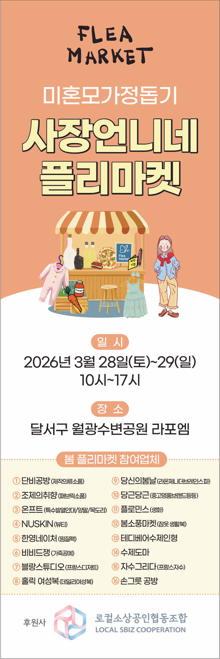 대구 지역 소상공인들이 십시일반 힘을 모아 도움이 필요한 이웃에게 따뜻한 손길을 전한다. 로컬소상공인협동조합은 2026년 3월 28일(토) 10시~17시, 2026년 3월 29일(일) 10시~17시에 달서구 월광수변공원 라포엠(수밭길 43) 1, 2층 전관에서 ‘사장언니네’와의 따뜻한 동행으로 ‘제3차 상생 플리마켓’을 개최한다고 밝혔다.