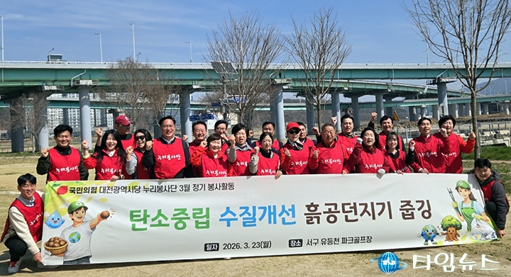 [대전타임뉴스=홍대인 기자] 국민의힘 대전광역시당 누리봉사단이 23일 유등천 파크골프장 일원에서 환경정화 봉사활동을 진행했다. 이번 활동은 세계 물의 날을 맞아 수질 개선과 탄소중립 실천을 위해 마련됐다. 참여자들은 EM 흙공을 하천에 투척하고 산책로 주변 쓰레기를 수거하는 줍깅 활동을 병행했다. 이은권 시당위원장은 “물의 소중함과 하천 생태계 중요성을 되새기는 계기"라며 “환경보호 활동을 지속하겠다"고 말했다. 정철 누리봉사단장은 “지역 주민에게 환경보호 인식을 확산하는 계기가 되길 바란다"고 말했다.