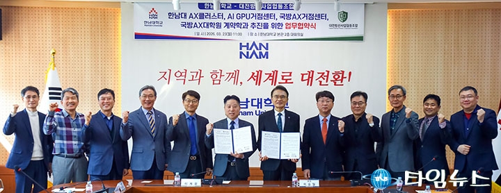 [대전타임뉴스=홍대인 기자] 한남대학교와 대전방산사업협동조합이 3월 23일 방위산업 경쟁력 강화를 위한 업무협약을 체결했다. 이번 협약은 대학 AI 인프라와 기업 네트워크를 결합해 지역 방산 산업 발전을 추진하기 위해 마련됐다. 양 기관은 AI거점센터 참여와 인프라 공동 활용, 채용연계형 학위과정 운영 등에 협력하기로 했다. 또 국방로봇과 국방센서 분야 맞춤형 교육과 현장 실습, 산학 멘토링을 공동 추진할 계획이다. 이승철 총장은 “연구인력 취업 연계 체계를 구축하고 방산 산업 시너지 창출을 기대한다"고 말했다.