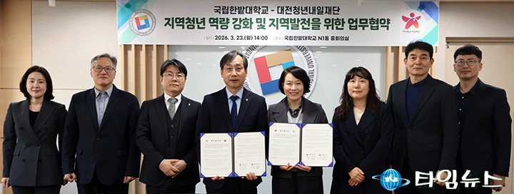 [대전타임뉴스=홍대인 기자] 국립한밭대학교는 23일 대전청년내일재단과 청년 지원 협력을 위한 업무협약을 체결했다고 밝혔다. 이번 협약은 지역 청년의 역량 강화와 진로 지원을 위해 추진됐다. 양 기관은 청년 지원 사업과 진로 설계 프로그램 운영에 협력하기로 했다. 또 청년 정책 개발과 인적 교류, 자립 청년 지원 방안 마련에도 공동으로 나설 계획이다. 오용준 총장은 “청년 지원 프로그램을 통해 지역 인재 양성에 기여하겠다"고 말했다. 권형례 대표이사는 “청년 정책과 프로그램 협력을 확대하겠다"고 밝혔다.